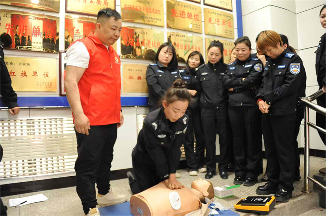 培训中,讲师结合公安工作实际,采取“理论讲解+示范教学”“实际操作+考核验收”相结合的方式,重点围绕AED(自动体外除颤器)使用流程、心肺复苏术(CPR)、创伤救护(止血、包扎)、气道异物梗阻处理等专业急救知识进行讲解及示范,让大家深刻认识到掌握急救知识的重要性和必要性。