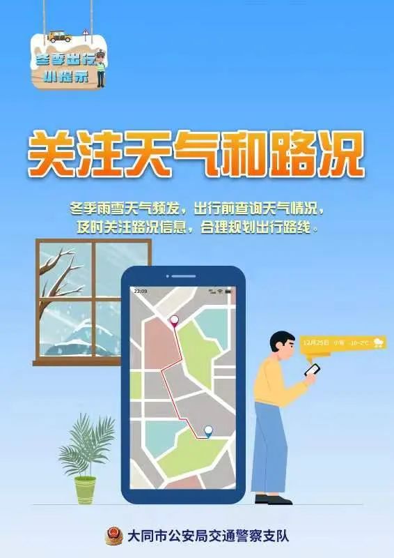 进入冬季,雪雾结冰等恶劣天气多发,道路交通安全隐患增多、风险加大,驾车出行前请关注天气变化,冰雪路段行驶时,请与前车和两侧保持有效制动距离和安全间距,尽量避免频繁并道。行驶过程中请注意观察行人,应减速慢行、耐心避让,时刻绷紧交通安全弦,牢固树立交通安全意识。