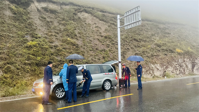 雨中为车主换轮胎,他们淋湿了全身