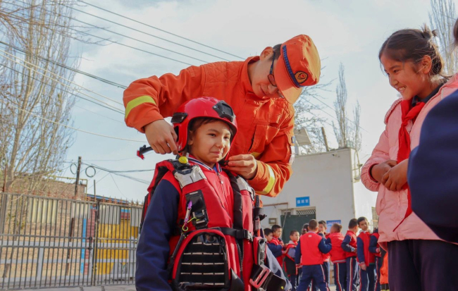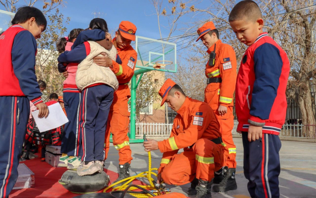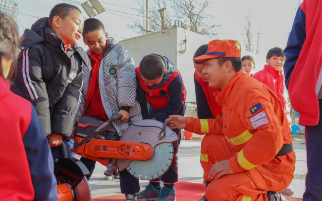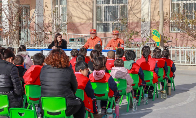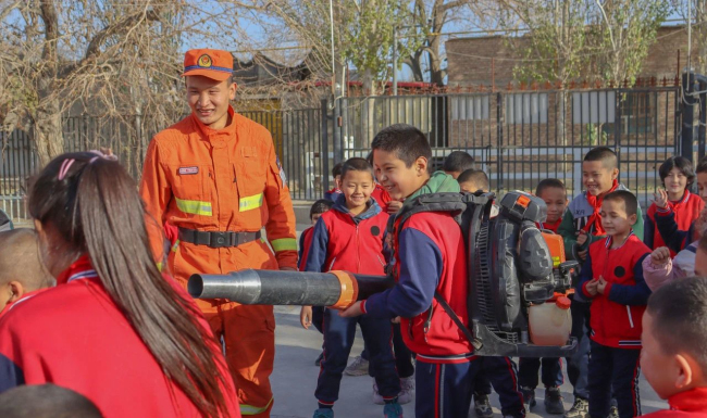 “同学们,森林是我们人类赖以生存的基石,保护森林,就是保护我们自己,护林防火是我们每个人的责任,你们能不能做到呀?”同学们踊跃的说道:“我们能做到”。库尔勒大队“火焰蓝”应急科普宣传小分队采用集体讲座方式给同学们科普了森林防火小知识,充分调动起同学们学习防火知识的兴趣,进一步强化了他们森林防火观念。
