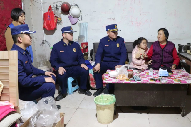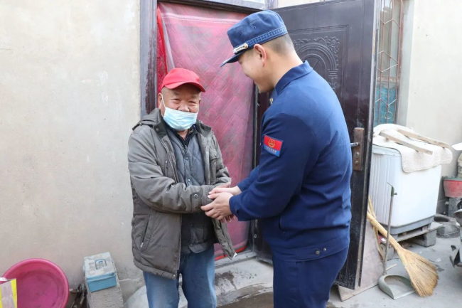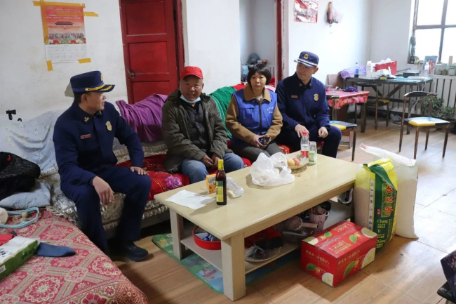 本网讯:(陈一平)为深入推进主题教育走深走实,进一步弘扬消防队伍的优良传统,帮助贫困群众解决实际困难,11月26日,新疆森林消防总队巴州支队阿克苏大队联合驻地火车站社区走访慰问困难群众,送去“火焰蓝”的祝福和关爱。