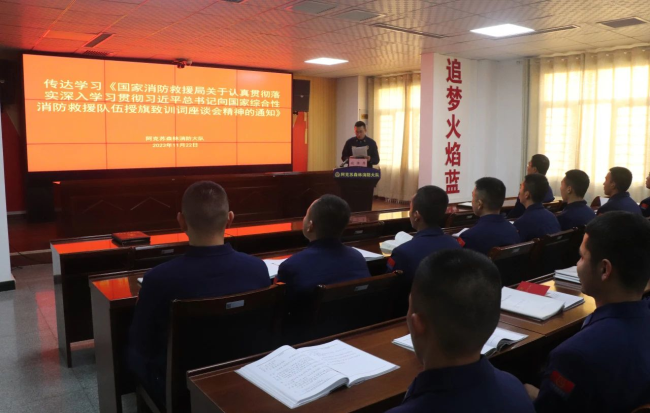 本网讯:(王旭东)为引领全体指战员牢记领袖训词、践行初心使命、永葆奋斗姿态,近日,巴州森林消防支队阿克苏大队坚持政治引领,突出铸魂育人,集中传达深入学习贯彻习近平总书记授旗致训词座谈会精神,助推第二批主题教育活动走深走实。