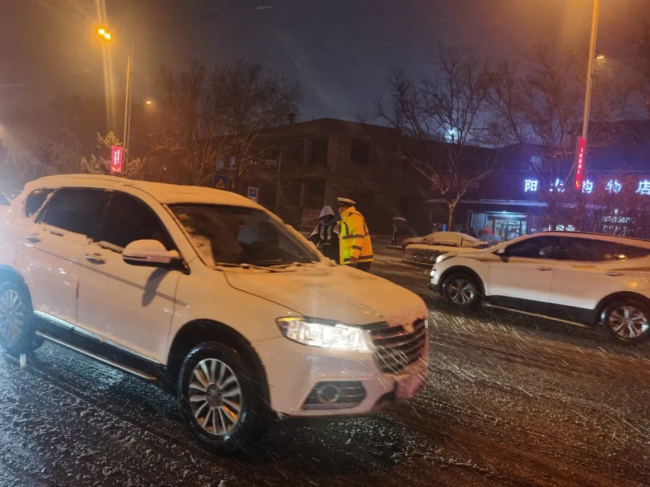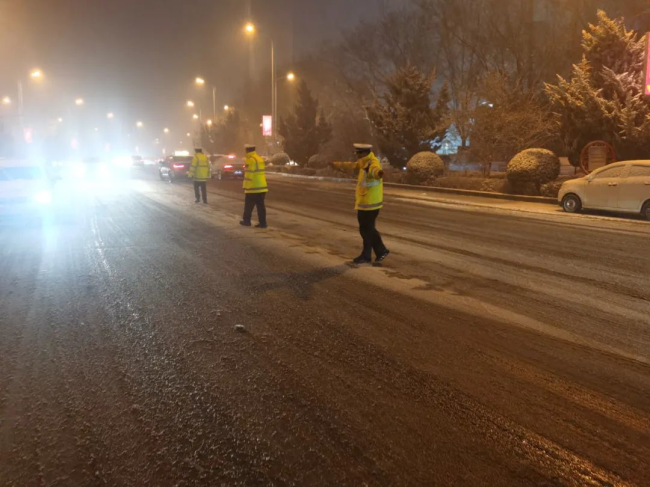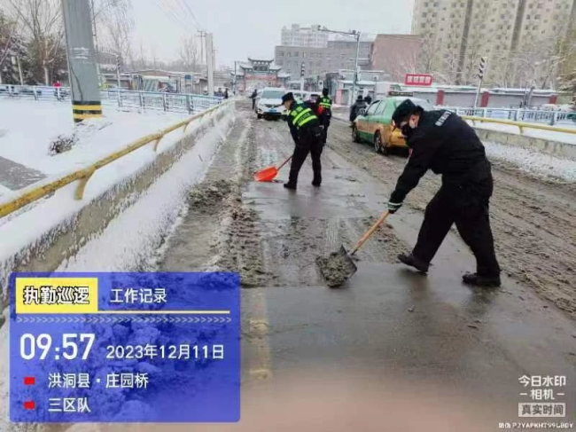 风雪之中,“警”色相随。12月10日,受冷空气影响,洪洞县迎来大面积强降雪天气,洪洞公安闻"雪"而动,迅速启动恶劣天气应急预案,全面加强巡逻防控力度,积极救援被困车辆和人员、开展重点路段道路交通管控疏导,全力以赴守护辖区人民群众平安。 巡逻防控 保民平安 坚守岗位,保畅交通 风雪扑面 "警色暖人" 巡特警大队民辅警在巡逻过程时发现一辆小型轿车因雨雪天气路滑导致车辆无法行驶,立即上前帮助车辆脱困。 ![]() ![]() ![]() 为确保群众出行安全,巡特警大队民辅警及时清理路面积雪。