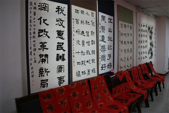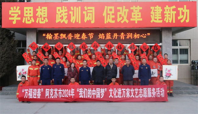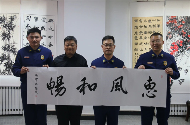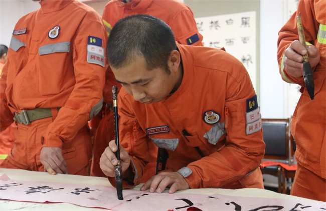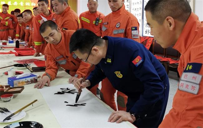 春节将至,为弘扬中华民族传统文化,丰富队员业余文化生活,营造节日喜庆氛围,近日,巴州森林消防支队阿克苏大队联合阿克苏市书协开展“翰墨飘香迎春节,焰蓝丹青润初心”书画进消防主题活动。阿克苏市书协贺杨主席等一行4人,巴州森林消防支队张斌政委出席活动。