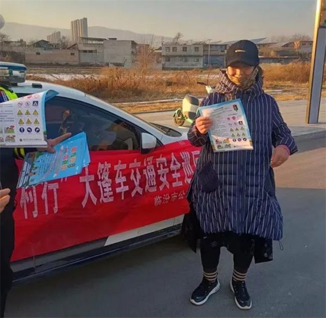 本网讯:(王新晋)为全力做好春运交通安全宣传工作,进一步提高农村群众的道路交通安全意识、法治意识,有效预防和减少交通事故的发生,确保辖区农村道路交通安全畅通、和谐有序。1月23日,尧都区公安局交警大队三中队、四中队、五中队民警走进辖区农村开展以“爱临汾 赢未来 平安春运 交警同行”为主题的交通安全宣传活动。