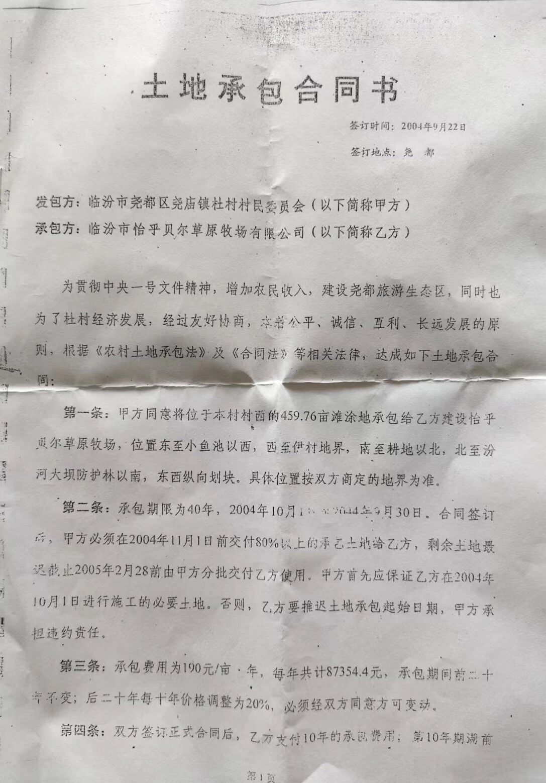 ![]() ![]() 汾河小镇土地承包合同首页。来源:受访者提供