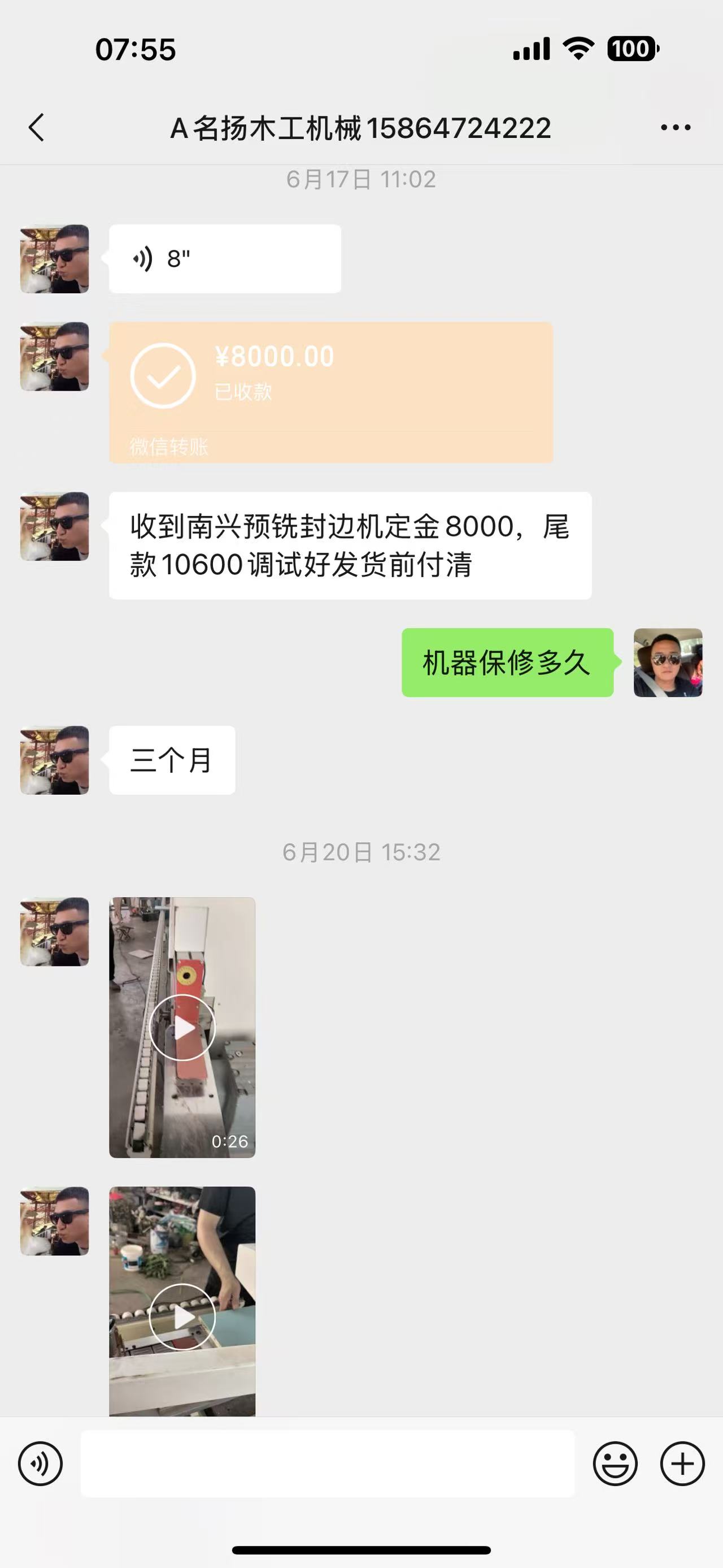 我是河北省武安市东长远村人,我叫贾,电话159xxxxxx8,在抖音上看到有一个专业卖二手木工机械,山东省青岛市黄岛区庄家岛耳河村名扬木工机械,他叫张扬。山东省青岛市黄岛区人电话15864724222。 2025年6月17日我在微信给他交了8000元的定金,定二手南兴封边机一台,交定金的时候张扬答应我所有刀具都是新的。我们的要求是封套装门(门板50毫米的厚度),他们调试机器只用18毫米厚的板材试机,说保证封门板没有问题,后来我又定了一台门锁开槽机器,还有两个除尘,一共下来给他转帐37700元,货到有什么问题视频联系安装。 但是货到以后打视频就是爱理不理,说我自己笨嫩不了,他也不懂花2000元派技术人员来调试,我就又打2000元等技术人员来了以后又说缺少配件不能正常使用,技术需要住两天等配件等的期间我得再出1200的工钱,我出了1000,到了最后技术人员说机器太老不稳定,第二台机器需要密码也不能调试,张扬又说可能头一个客户有欠款厂家给锁了嫩不到密码。 我们要求退机,张扬说走起诉程序吧,他买的别人的他也是受害者,机器退不了。