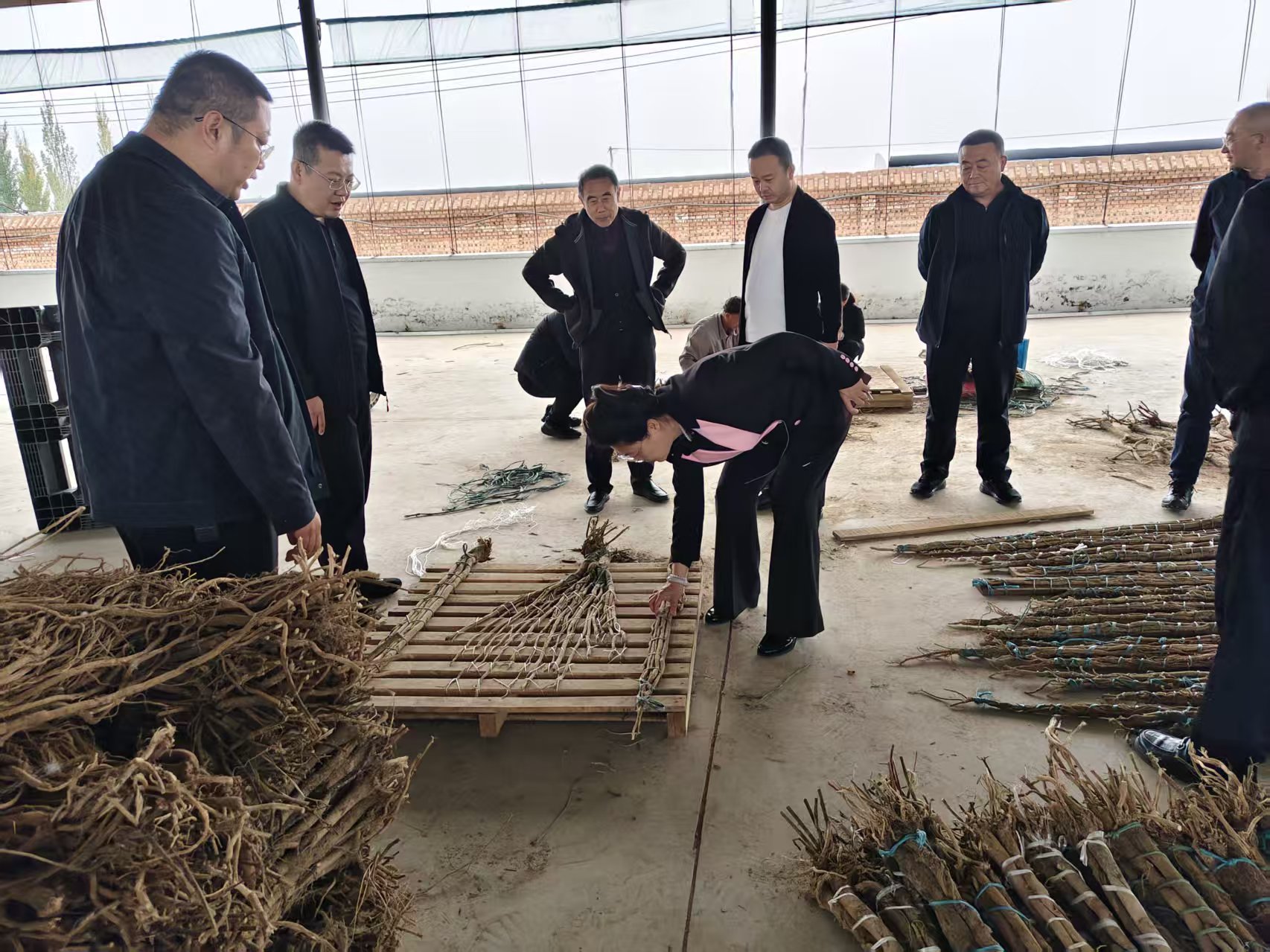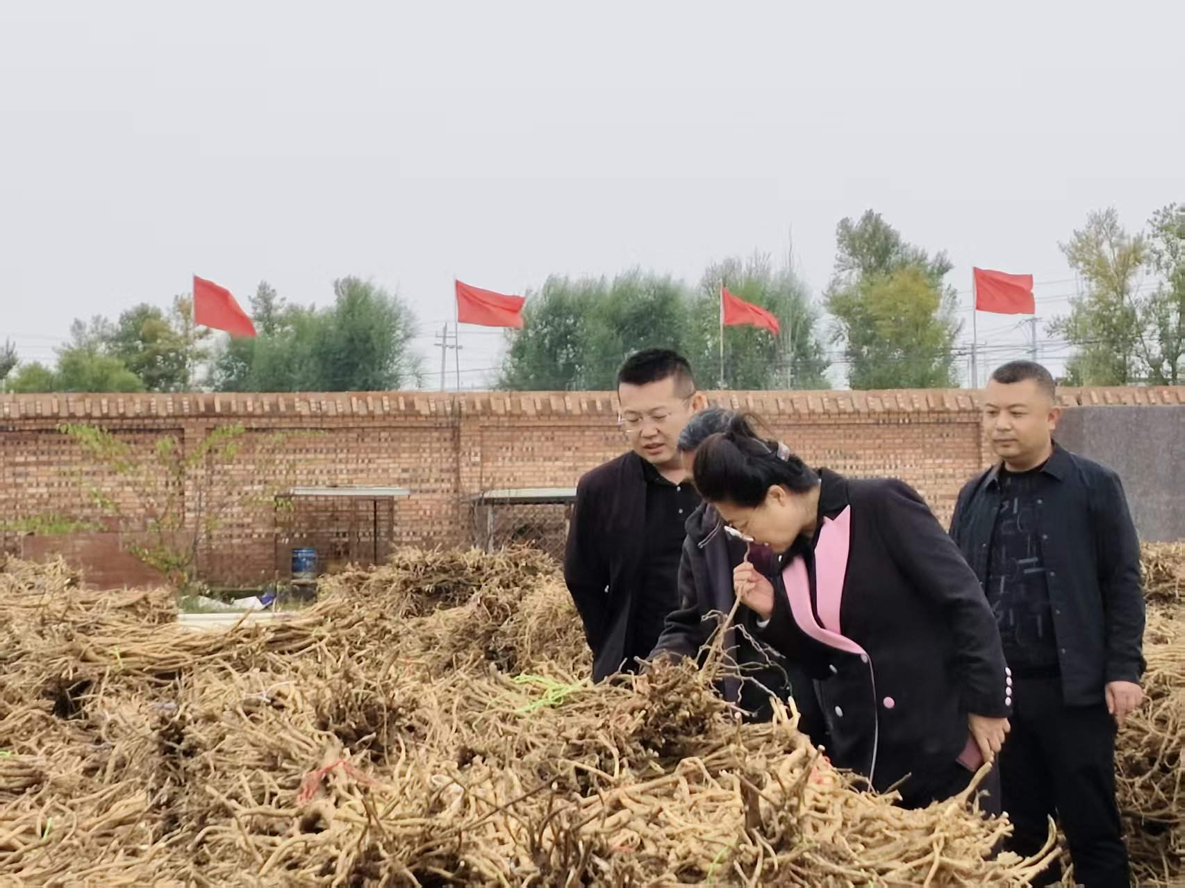 在黄芪露天仓储区,县委常委、统战部部长贺春丽俯身贴近黄芪根茎,轻嗅其独特药香,指尖拂过纹理清晰的根茎,“这股清香味、这份扎实感,是千里马黄芪品质的最好证明。”她强调,药材品质是产业立身之本,每一根黄芪的品相、气味都关乎品牌口碑。