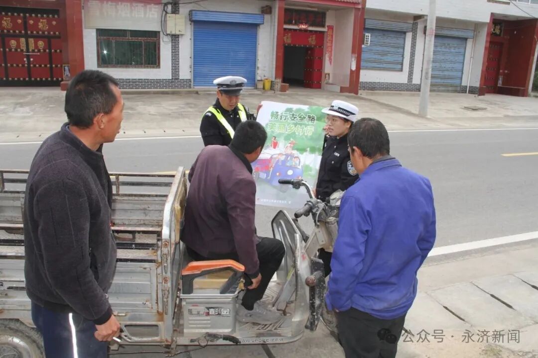 活动中,民辅警针对农村地区交通出行特点以及常见的交通安全风险,结合近期发生在本地农村地区的典型交通事故案例,以案说法,用通俗易懂的“乡土语言”剖析事故成因,让村民们直观感受到农用车、三轮车违法载人、无证驾驶、酒后驾车、骑乘摩托车和电动自行车不佩戴安全头盔、驾乘汽车不系安全带等交通违法行为可能带来的严重后果,深刻认识到遵守交通法规的重要性。同时,民辅警还针对大家出行实际,有针对性普及交通安全法规知识、传递“一盔一带”安全守护理念,重点加强对农村面包车驾驶人、摩托车和电动自行车骑乘人员的针对性警示教育和安全提示,引导他们自觉摒弃交通陋习,争做文明交通的践行者